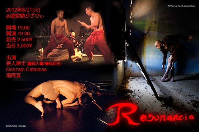 妄人文明presents 「Resonancia〜共振的〜」 8月21日タマシイが共鳴しあう! ■妄人文明 Wangnin Bunmei presents 「Resonancia〜共振的〜」 ・2012年8月21日(火) 21st August, 2012 (tue) ・19:00 open 19:30 start ・Ticket: adv ¥2,500 door ¥3,000 ・Place: 遊空間がざびぃ(西荻窪)Yu-Ku-Kan Gazavie (Nishi Ogikubo) 東京都杉並区西荻北5-9-12 そらの上 03-3395-0133 http://www.gazavie.com/ ■出演■ ∞ゴンサロ・カタリナス∞(スペイン) 「死衣−暗闇を抜けた後にみえてくるもの」 音楽:筒井み