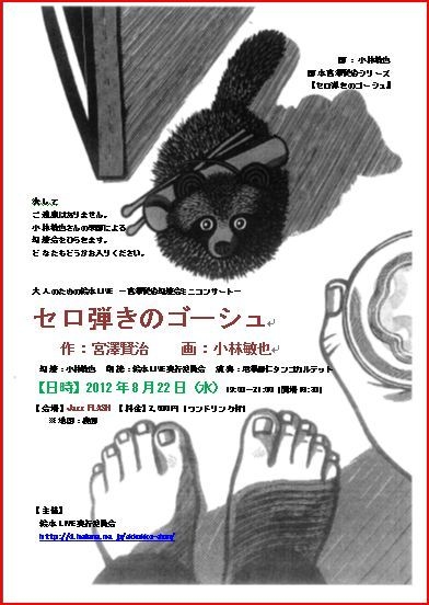 画本宮澤賢治シリーズの、小林敏也さんをお招きして、 小林さんの原画による絵本LIVE(宮澤賢治幻燈会)を開催します! 〜セロ弾きのゴーシュ〜 2012.8.6(月)〜 小林敏也さんの原画展と画本販売@北書店 http://kitashoten.net/ ※北書店での幻燈会は行いません。 2012.8.21(火)19:00〜 絵本LIVE@ビュー福島潟6階展望ホール http://www.pavc.ne.jp/~hishikui/ ゲスト:土佐美華(チェロ)中村哲子(ピアノ) 2012.8.22(水)10:30〜 絵本LIVE@新潟市立中央図書館3階ビーンズホール http://www.niigatacitylib.jp/ ゲスト: