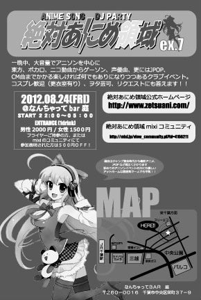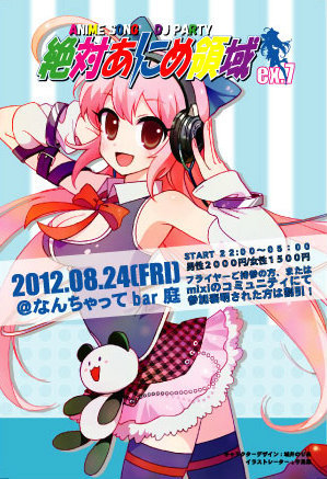 一晩中、大音量でアニソンを中心にボカロ、東方、ニコ動曲からゲーソン、声優曲、 更にはJPOP、CM曲までかかる楽しければ何でもありになりつつあるクラブイベント。 コスプレ歓迎(更衣室有り)、ヲタ芸可、リクエストにも答えます!! アニソンイベントの細分化が進む中、全く細分化しないで 王道アニソンイベント街道を突き進むイベント!! アニヲタもアニメはあんまり詳しくない人も楽しめるイベントを目指します!! 絶対あにめ領域エクスタシー7も、バーなのに音響抜群! レーザー5台!!モニター5台というクラブ以上の設備の