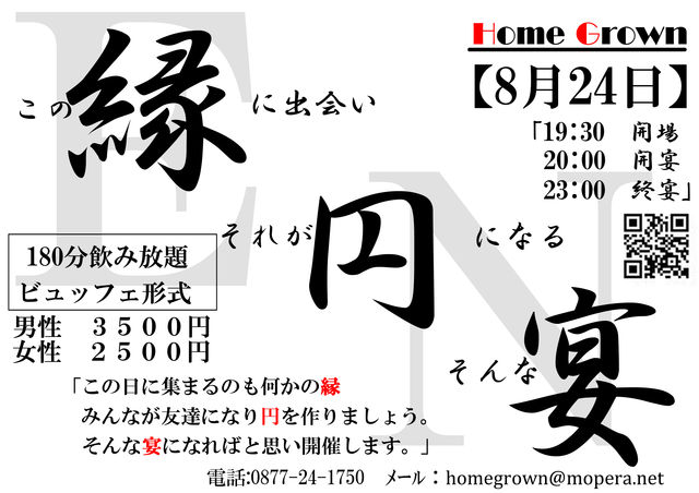 8/24(金)は 縁 円 宴 でーす。 Friend Ship Partyが奇数月、えんが偶数月のイベントにしていこうと思います。 この縁に出会いそれが円になる。そんな宴のパーティーです。 今回もわかりやすく友達がほしい方、出会いほしい方はぜひきがるーに参加してく ださい。 完全ご予約制なんで、ご予約の際は自分に連絡くれるか下記のアドレス、HPからでも受け付けてまーす。 お気軽にどーぞー ◆◆◆◆◆◆◆◆◆◆◆◆◆◆◆◆◆◆◆◆ イベント名: 縁 円 宴 日にち: 8月24日(金曜日)