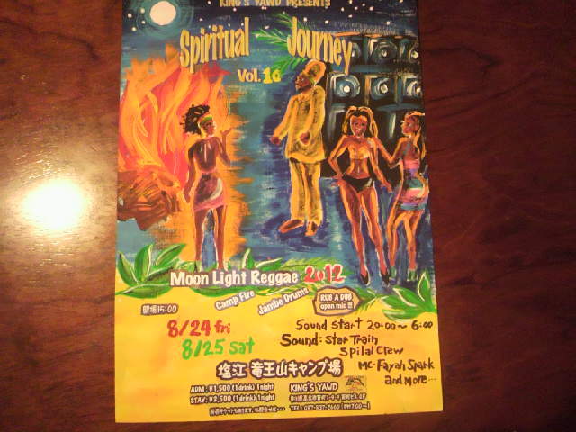 今年で10周年を迎えるMOON LIGHT REGGAE!! 高松のジャマイカレストラン KINGS YAWDが主催するキャンプ場でのレゲエイベント。 ジャマイカレストランには、国際色豊かなお客さんがやってくる。 その中でも最近マイクを握り、MCを始めたジャマイカ人女性FAYAH SPARK!!!!は必見!!パトワを学びたいなら彼女にお任せ〜 さらに愛知出身のSTAR TRAINは、新人ながらも長時間一人でジョグリンをこなす。 また、徳島からもジャマイカ長期滞在を経て帰ってきたA4J AND MORE!!!! ファミリーでお越しのお客様は、キャンプファ