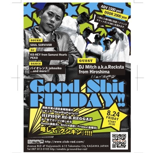 『Good Shit FRIDAY!!!!』 偶数月第4週目金曜開催のレギュラーNewBigParty!!!! HIPHOP,R&B,REGGEAが一夜でガッツリ楽しめる Good(偶数月)、Shit(4週目)、Friday(金曜日) 略して『グシキン』!!!! ■START 23:00 @Sound Bar RAD ADV:1500yen DOOR:2000yen ※共に入場の際に別途1ドリンクチケット代(\500-)を頂きます。 ■Guest DJ Mitch a.k.a.Rocksta from Hiroshima ■SOUND SOUL SURViVOR ■DJ HO-HEY (Samurai Heats) PEKO ■DANCE バイオレンスjohnoiko JUICE HP http://www.club-rad