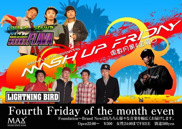 管理人様告知失礼します。 偶数月第4金曜日はレゲエ ナイト(●´ω`●)ゞ MASHU UP FRIDAY ★Collie Man fr.SOUND FLAVA ★REACE fr LIGHTNING BIRD W birthday bash!!!!!!! Open 22:00 〜 TillMorning 入場:1000yen 女性 24:00まで入場無料 ※ドリンク別途 500yen @SOUND SPACE MAX ■GUEST SOUND SOUND FLAVA ■SOUND TAKA LIGHTNING BIRD Foundation 〜 Brand Newはもちろん 様々な音楽を幅広くお届けします。