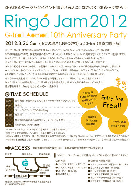 ゆるゆるダージャンイベント復活〜 2008年を最後に3年間、開催をお休みをしていましたが、今年はGトレイル10周年記念!ということで、復活します! BBQパーティーでもしながらわいわい楽しみましょう! りんごJAMはコンテストではありません。みんなでただひたすら乗って喋って遊ぶ、それだけです。 ダートは初心者でも楽しめるとても素晴らしいものですが、なかなかトレイルで乗る機会がない方も多いと思います。 Gトレイルは、多くのジャンプがテーブルトップとなっており、初心者向けのジャンプなしのライン「ひめライン」(今で言うパンプ