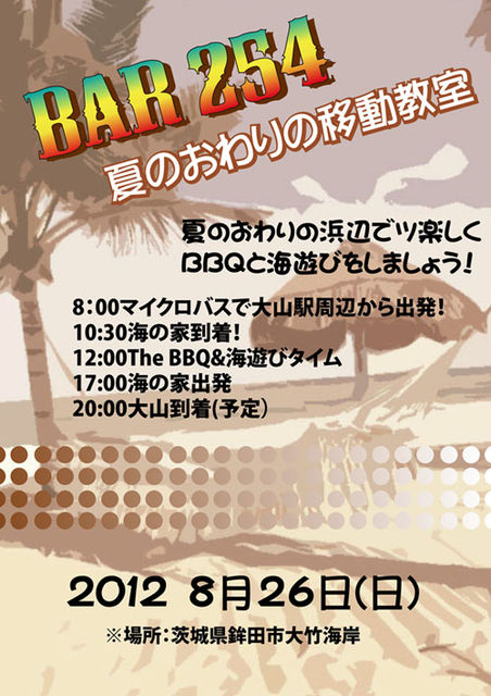 BAR254イベントの告知です。 8/26(日)「夏のおわりの移動教室」 夏も終わりの頃、茨城の海水浴場にみんなでBBQと海遊びする企画です。 マイクロバスを借りて移動するので何も気にせず飲めます! スケジュール(予定)8:00大山駅周辺集合→大竹海岸(17:00帰路)→20:00大山到着。 場所は茨城県鉾田市大竹海岸。 参加料金は交通費(バス代)3,000~3,500円 海の家使用料金+BBQ代(海の家指定金額)2,000円 合計5,000~6,000円くらいと考えております(多少上下する可能性あり) あとは別途自分で飲みたいものや食べたいもの持参。 マイクロバスの定員