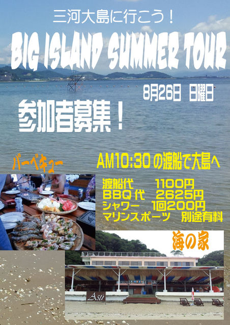 三河大島に行こう!海水浴&BBQ 参加者募集です〜〜 三河湾に浮かぶ無人島、三河大島 愛知県NO.1のリゾートアイランド そんな素敵な大島で夏のラストを楽しみませんか? 8月26日 日曜日 AM10:30の渡船で三河大島へ 海水浴&海の家 アスティーにてBBQ (アスティーはアニキが働いています!) 渡船代 1100円 BBQ代 2625円 シャワー 1回200円 マリンスポーツ バナナボート マリンジェット 別途有料 詳しくはマスターま