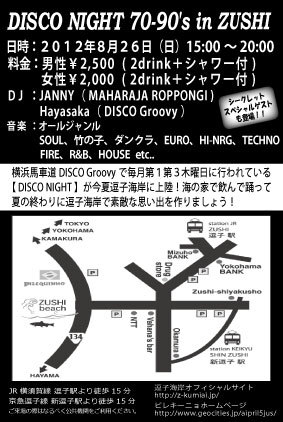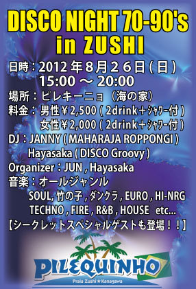 横浜、馬車道にあるDisco Groovyで毎月第1、第3木曜日に行われている【DISCO NIGHT 70−90`s】が 逗子海岸に上陸です!HI-NRG、EURO,ダンクラ、竹の子・・・etcオールジャンルで楽しめるイベントです。 日時 8月26日(日) 15:00〜20:00 場所 逗子海岸 海の家 ピレキーニョ 料金 男性 \2500(2drink+シャワー付き) 女性 \2000(2drink+シャワー付き) シークレットスペシャルゲストも登場!水着OK! 夏の終わり、海を目の前に飲んで踊って楽しい時間を過ごしましょう!
