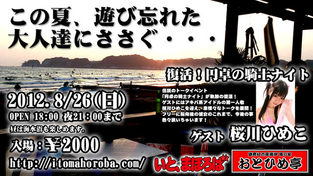 ■タイトル:トークLIVE『円卓の騎士ナイト』 オスカープロモーションの芸人さん達によるお笑いLIVE! ■日付:2012/08/26(日) ■時刻:19:00頃(詳細は改めて告知されます) ■場所:鎌倉材木座海岸 海の家 おとひめ亭 神奈川県鎌倉市材木座6-14-20 ・URL:http://www.otohimetei.com/ ■料金:2000円 予約不要なので、光明寺に行った帰りとかにも ふらっと立ち寄れます 歌のステージではなく、トークライヴです 楽しいお話や、進めてるものとかも 海の近くのシチュエーションで お話出来ればしたいな、なんて思っ