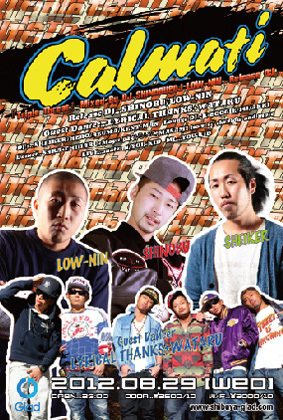 管理人様書き込み失礼します。 8月29日(Wed)『Calmati』@渋谷Glad! ------■□■□■□■□■□■□■□■------ ★ゲストでの入場方法★ エントランスにて 『シノブのゲストでカルマ』 と、伝えて頂ければ [通常] 2500円1D のところを [ゲスト] 1000円0D にてご入場頂けます。 ---------■□■□■□■□■□■□■□■ --------- DATE: Wednesday 8月29日 TIME: 23:00 ~ LATE PRICE: DOOR¥2000/1D W/F¥1500/1D GENRE: Hip Hop 前回一周年Anniversaryを迎え、みなさんのおかげで二周年目に突入した“Ca