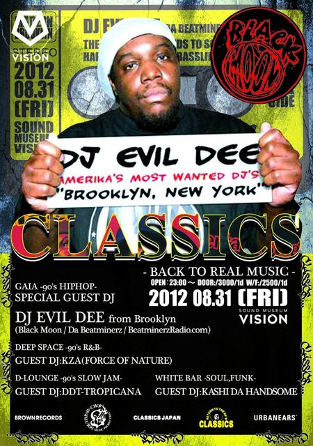 管理人様告知失礼いたしますm(__)m 8/31(fri) CLASSICS@VISION もはや、VISIONではなくてはならないパーティ”CLASSICS”。黄金期と言われる1990年代にスポットをあてた、HIP HOP、R&B、SLOW JAMのブラック・ミュージック・タイム・トラベル。各フロアのジャンルのコンセプトを軸に技巧派のレジデントDJ、SOUTHPAW CHOP、K-BOOGIE、YO-GIN等が、スピンする。さらに今回Da BeatminerzのDJ EVIL DEEの出演も決定した。回を重ねる度に、虜になるオーディエンスが増大している事が、何よりもこのパーティが、日本最大規模のブラック・ミュージックの