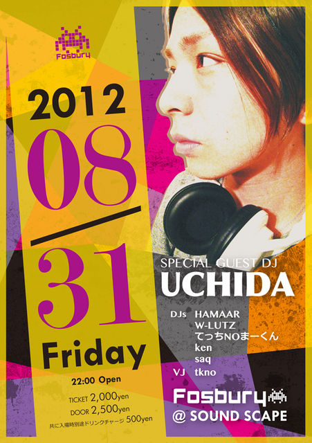 管理人様 告知失礼致します。 Fosbury 2012.8.31(FRI) @SOUNDSCAPE 22:00 OPEN TICKET 2000YEN DOOR 2500YEN 別途ドリンクチャージ500円 <SPECIAL GUEST DJ> UCHIDA <DJ> HAMAAR W-LUTZ てっちNOまーくん ken saq <VJ> tkno - UCHIDA - SENSITIVEでDELICATEな感性でセレクトしたCUTTING EDGEなTRACKを駆使し、 エレクトロニカやミニマルな音をバックボーンとしながらも、 FIDGET、ELECTRO、TECH HOUSE、PROGRESSIVE HOUSE等、 多彩な音のGROOVEを操りFLOORをDESIGNしていくFLOOR STYLIST。 現在中