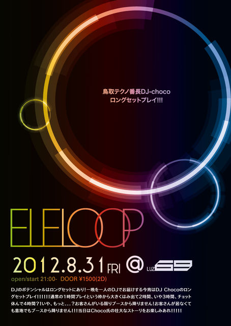 2012/8/31金は 鳥取テクノ番長DJ-chocoの ロングセットプレイ!!!!!!!! open / start 21:00- DOOR 1500(2D) イベント名は「ELELOOP(エレループ)」 ELEKITEL(エレキテル)を一人でループさせるという意味で。 /////////// DJのポテンシャルはロングセットにあり! 一晩を一人のDJでお届けする今宵はDJ Chocoのロングセットプレイ!!!!!! 通常の1時間プレイという枠から大きくはみ出て2時間、いや3時間、 チョット休んで4時間?!いや、もっと...? お客さんがいる限りブースから降りません! お客さんが居なくても意地でも