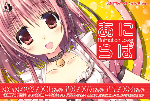 こちらに「参加します」と事前の参加表明をいただいた場合、入場料が500円オフになります。 参加表明をしてからのキャンセルなども大丈夫ですので、ご来場予定の方々はお気軽にお使い下さい。 尚、ディスカウントの複数の併用は不可となっておりますので、ご了承下さい。 ★★★★★★★★★★★★★★★★★★★★★★★★★★★★★★★★ ☆あにらば-Animation Lover vol.21☆ アニソン原曲寄りのRuby Floor、A-POP寄りで多ジャンルのSapphire Floorの2フロアで楽しめますのでみんなで思いっきり高まりましょう!