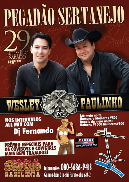 Pegadão Sertanejo no Rancho Babilônia em Gunma, super balada com show ao vivo da dupla Wesley e Paulinho cantando o melhor da música sertaneja e nos intervalos Dj. Fernando mandando o melhor do All Mix, prêmios especiais para os cowboys e cowgirls mais bem trajados da noite! Não percam!!