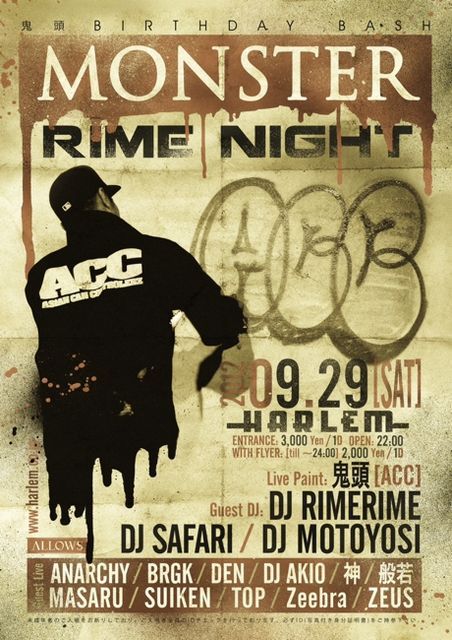 管理人様、告知失礼致します。 9/29土曜!! 豪華ラッパー陣が集結!! この日を逃す訳にはいきません! 詳細 9/29 MONSTER SP×RIME NIGHT OPEN22:00 DOOR3000/1d DJ RIME RIME SAFARI MOTOYOSI NOBU a.k.a BOMBRUSH AKIO GUEST LIVE ANARCHY BRGK DEN DJ AKIO 神 般若 MASARU SUIKEN TOP Zeebra ZEUS エントランスにて ★★★★★★★★★★★★★★★★★★★★★★★★ 「アローズのゲストでmixi」 とお伝え頂ければ 通常3000のところを 2000/1d で入場できます!! ★★★