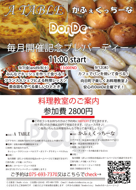 管理人様、貴重なスペースでの告知失礼致します。 お待たせしました フランス人が経営するオシャレな隠れ家カフェでお気軽な料理教室がはじまります!! 今回は昼間の時間を有効に使って料理を楽しく学ぶパーティーです 私もものすごく楽しみでス 今回は「キッシュ」をみんなで作って・食べて・おいしいランチで大満足 フランス人によるお気軽料理教室。 付き添いのお子様は200円で参加できます(ジュースのみ付きます) 今出川 クッキングパーティー ■イベント詳細■