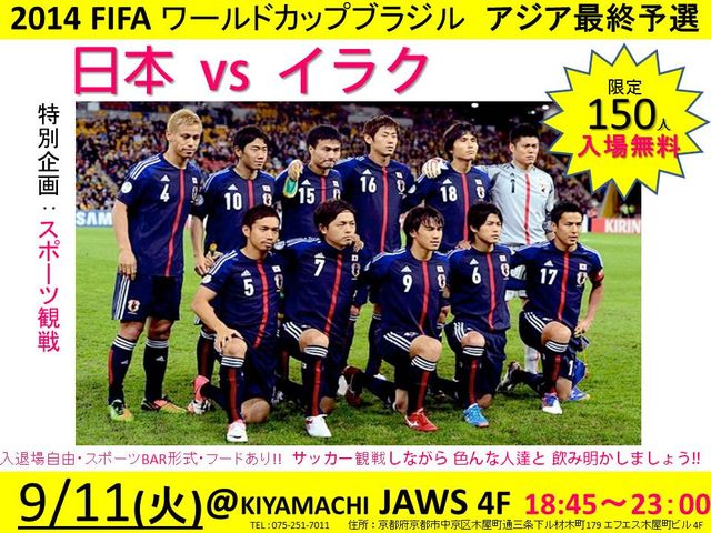 2014 FIFAワールドカップブラジル アジア最終予選 日本vsイラク 【入場無料 150人限定】 2012年 日本代表戦を応援しませんか この日は特別にスポーツバーみたいな感じです 80名〜100名様くらいは着席して観戦して頂けます!! 映像は、、、、 プロジェクター 3台で、 大型のスクリーンに投影します 老若男女 サッカー観戦で盛り上がりたい方が集まります 入場料はなんと、、、、無料