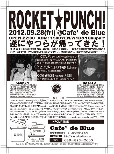 ¤Ä¤¤¤ËÌÀ¸åÆü¤Î¶âÍˤȶá¤Å¤¤¤Æ¤¤Þ¤·¤¿¡ª¡ª¡ª µ×¡¹¤ÎROCKET PUNCH!¡ª ËͤÈKENKEN¤µ¤ó¤¬°ìÈÖ²õ¤ì¤ë¥¤¥Ù¥ó¥È¡ª¡ª¡ª ¡ÊROCK¡¢ELECTRO¡¢HOUSE¡¡Let's Dance¡Ë ¥¬¥¢¡¼¡¼¡¼³Ú¤·¤ß¡ª¡ª¡ª À§ÈóÍ·¤Ó¤ËÍè¤Æ²¼¤µ¤¤♩♩♩ 2012.09.28 (Fri) ¡ÖROCKET PUNCH! ¡× ~ Chupa Chups present ~ OPEN:22pm ADM:1500yen (1D&1Chupa!?) DJ¡§ROCKET PUNCH! SUPPORT DJ¡§KINMO¡¢SHOGO¡¢MAI VJ¡§ÅűÆ