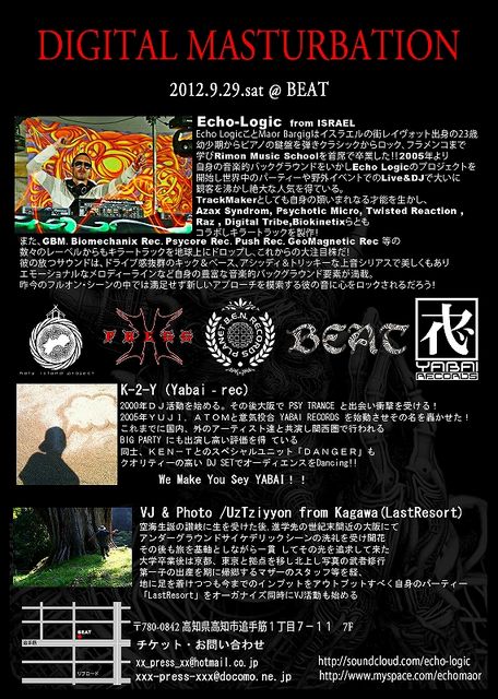 ¿§¤ó¤Ê¥¤¥Ù¥ó¥È¤¬ÂæÉ÷17¹æ¤Î¤»¤¤¤ÇÃæ»ß¤Ê¤Ã¤Æ¤ª¤ê¤Þ¤¹¤¬¡¢ X¡¾PRESS¤ÎDigital¡¡Masturbation¤Ï¤ä¤ê¤Þ¤¹¡ª¡ª ±«É÷¤Ê¤ó¤«¤Ë¡Á¡ª¡ª ÂæÉ÷¤Ë²¿¤«¡Á¡Á¡ÁÉ餱¤Þ¤»¤ó¡ª¡ª Echo Logic Japan Tour Digital Masturbation @BEAT 22:00 tAkeshi 23:00 SATOSHI 24:00 TAKAO 1:00 ECHO LOGIC (LIVE SET) 2:00 K-2-Y 3:00 HAMACH! 4:00 ECHO LOGIC (DJ SET) 5:00 ?????
