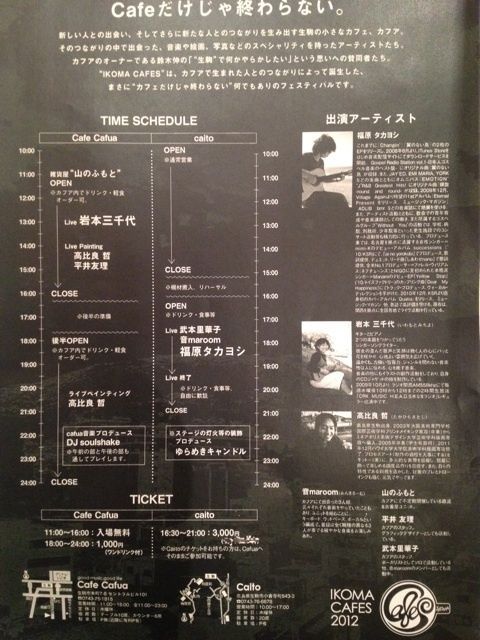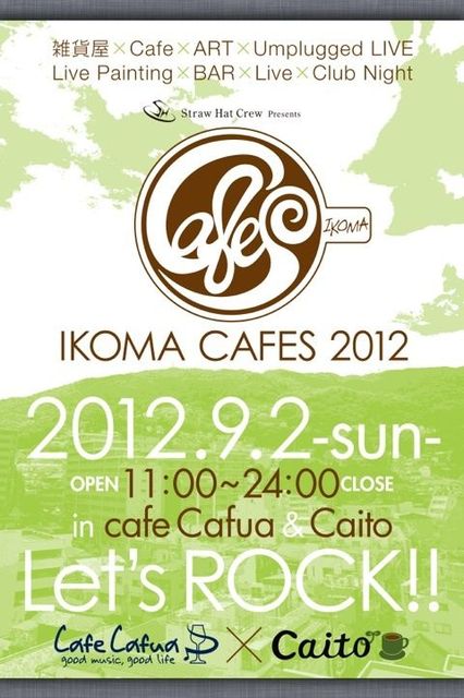 *................................................* 『IKOMA CAFES 2012』 *................................................* 日時:2012年9月2日(日) 一部 14:00〜(投げ銭) 二部 21:00〜(チャージ1000円+Drink500円) 会場:Cafe cafua ※cafe cafuaの営業は11時〜16時、18時〜24時です。 岩本三千代より〜 生駒にあるカフェ、CafuaさんとCaitoとの共同イベント 奈良県生駒で何か楽しい事をといつも考えてらっしゃるcafuaオーナーの鈴木さん。 cafeとアート、音楽が