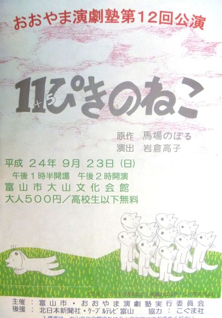 おおやま演劇塾第12回公演は、馬場のぼる原作『11ぴきのねこ』です。 お知らせが大変遅くなってしまったことをお詫びします。 小学6年生が中心となって小道具や衣装などを手作りしたり、歌にも挑戦。 面白いものにしようと塾生一同稽古に励んでおります。 ぜひご覧ください。