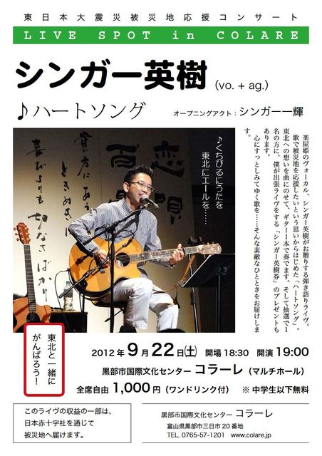 東日本大震災被災地応援コンサート『ハートソング』                     @富山県黒部市   ■2012年9月22日(土)   ■会場:黒部市国際文化センター《コラーレ》       富山県黒部市三日市 20 番地       0765-57-1201   ■開場 18:30   ■開演 19:00   ■料金:1,000円(ワンドリンク付)       全席自由(中学生以下無料)   ■出演    ・Opening act      シンガー一輝    ・Main act      シンガー英樹(vo & ag)    ・Guest