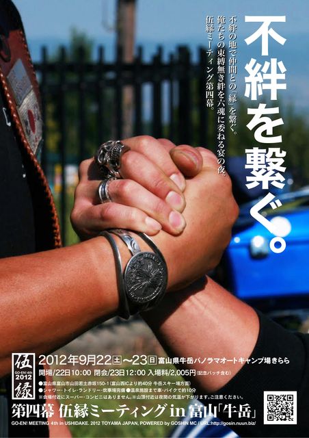 伍縁(ゴエン)Meeting 第四幕 日時 2012年9月22日・23日(土・日) 場所  富山県 牛岳パノラマオートキャンプ場きらら 住所 〒930-2112 富山県富山市山田若土赤坂150-1番地  ※富山西ICより約40分 入場料 2005円 パッチ込み・ウェルカムドリンク・記念五円 地図を見て頂いたら分かるとおり結構山奥です。。 もう景色は最高です!! シャワー・トイレ・ランドリー・炊事場完備でロケーションも最高! バイクで走って5分位の所に温泉もあります ただ、近くにはコンビ二、スーパーがないのでお泊りの方