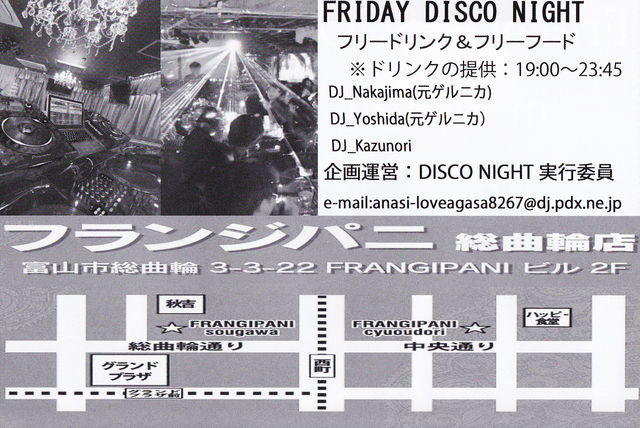 管理人さん、失礼します。 今回、約3年ぶりに”Friday DISCO Night"の開催します。 9/21(FRI)  「FRIDAY DISCO NIGHT」 DJ:中島(元ゲルニカ)/カズノリ     80's90's中心に懐かしのダンクラからハイエナ・ユーロビート、 そして、最新の曲と幅広い選曲でおおくりします。 会場:FRANGIPANI総曲輪 OPEN 18:45〜 START 18:59〜24:00? 前売り券:\3,500-(メール予約OK) 当日  :\4,000- なんとΣ(゚д゚lll)4時間以上の飲み放題にフード付きでの イベント開催となりました。 踊