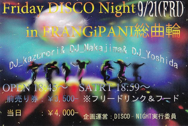 管理人さん、失礼しま〜す! (_´Д`)ノ~~オツカレー 今回、約3年ぶりに”Friday DISCO Night"の開催します。 9/21(FRI)  「FRIDAY DISCO NIGHT」 DJ:中島(元ゲルニカ)/カズノリ     80's90's中心に懐かしのダンクラからハイエナ・ユーロビート、 そして、最新の曲と幅広い選曲でおおくりします。 会場:FRANGIPANI総曲輪 OPEN 18:45〜 START 18:59〜24:00? 前売り券:\3,500-(メール予約OK) 当日  :\4,000- なんとΣ(゚д゚lll)4時間以上の飲み放題にフード付きでの イベ