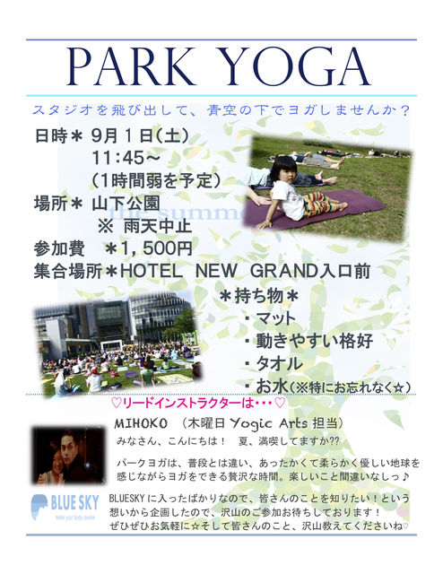 (管理人様、貴重なスペースお借りします。) 石川町駅の口コミNO1のBLUESKY鍼灸マッサージヨガスタジオで ヨガを教えています、MIHOKOと申します。 下記の日程で、 山下公園でパークヨガをやります♡(詳細は下記の通り。添付写真もご参考までに◎) 普段は身体を引き締めるためのボディーメイキング中心で教えていますが、 そんなスパイスも加えつつ、 今回は誰でも参加できるようなレベル等は全く問わない、 ヨガを気ままに楽しむゆるーいひと時にするつもりですので、 お近くの方や、ご興味ある方はぜひお気軽にお越し下さ