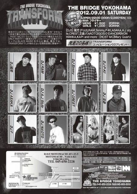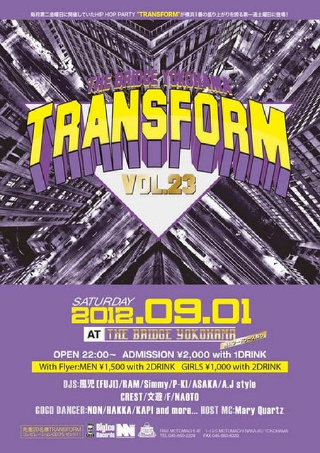 管理人様、告知失礼致します。 入場の際にエントランスにて 【シミーのゲスト】 と言って頂ければ ■女性 \1000/2d ■男性 \1500/2d と大変お得なゲスト料金で入場できます! お気軽にご利用下さい♪ ______________ TRANSFORM vol.23 @THE BRIDGE YOKOHAMA 横浜・元町 2012.09.01.[SAT] 毎月第二金曜日に開催していたHIP HOP PARTY "TRANSFORM"が横浜1番の盛り上がりを誇る第一週土曜日に登場! OPEN / 22:00 〜 [DOOR] 当日・一般 2000円/1DRINK ゲスト &