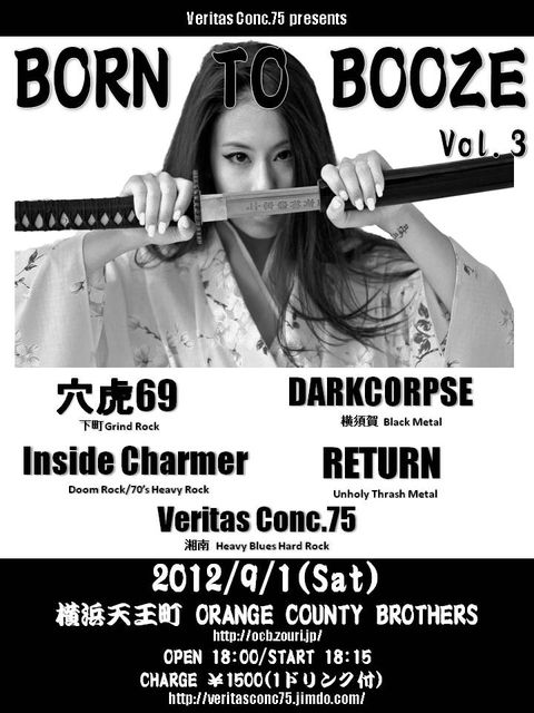 Veritas Conc.75 presents "BORN TO BOOZE Vol.3" @ ORANGE COUNTY BROTHERS http://ocb.zouri.jp/ bands ●穴虎69 ●RETURN ●Inside Charmer ●Darkcorpse ●Veritas Conc.75 open 18:00 start 18:15 charge¥1500(1ドリンク付)