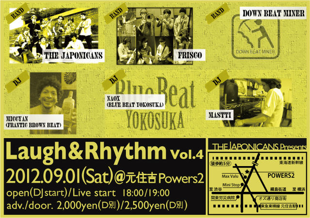 告知失礼致します。 不適切であればお手数ですが削除お願い致します。 The Japonicans企画です! ぜひぜひお越し下さい! 2012年9月1日(土) @元住吉Powers2 Laugh & Rhythm Vol.4 18時OPEN/DJ START 19時00分/LIVE START ADV. 2000yen(Drink別) DOOR. 2500yen(Drink別) BAND: THE JAPONICANS FRISCO Down Beat Miner DJ: MICCYAN(FRANTIC BROWN BEAT!) NAOX (BLUE BEAT YOKOSUKA Crew) MASTTI Powers2: http://www.powersbar.com/powers2/ 東急東横線元住吉駅から徒歩約5分 元住吉駅改札をでて右側のエスカレ