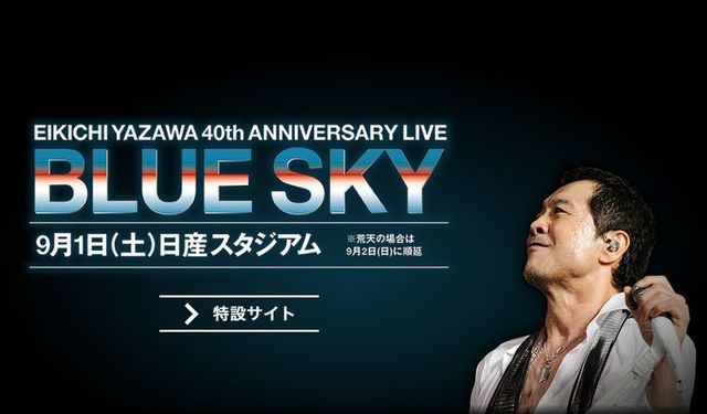 公演名 EIKICHI YAZAWA 40th ANNIVERSARY LIVE「BLUE SKY」 会場 日産スタジアム(横浜) 公演日 2012年9月1日(土) ※雨天決行、荒天の場合は9月2日に順延 2012年9月1日(土) ※雨天決行、荒天の場合は9月2日(日)に順延 15:30〜15:50 マキシマム ザ ホルモン 15:50〜16:10 The Birthday 16:10〜16:30 ギターウルフ 16:30〜16:50 怒髪天 16:50〜17:10 ザ・クロマニヨンズ 18:00〜 矢沢永吉