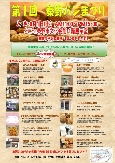 日時:9月1日(土) 11時〜15時 場所:神奈川県秦野市文化会館 1階 展示室 秦野市周辺の、こだわりのパン屋さん他、15店舗が集結! おいしい焼きたてパンの直売会です。 スイーツ、焼き菓子などetc… カフェコーナーもあります! お気に入りのパン、パン屋さんに出会える事、間違いなし!! ご家族、お友達、お誘いあわせの上、お越しくださいね。 お待ちしています。 参加店舗の紹介 パンのくま小屋 ゆっとまにぃ うずらとあずき ひだまりママ かばの小さなパン屋 プーピーパン 秦野精華園 小麦 丹沢ベー