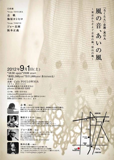 日時 2012/9/1 19:00スタート 場所 高岡 Cafe POULOWNIA (カフェポローニャ) 料金 1500円 当日1800円 (1drink付) 出演 Toyama ・志帆 ・梅原ヨシヒロ Tokyo ・ジョー長岡 ・阪本正義 富山からは、志帆さん いしじぃ企画や先日の村門で歌声を聴きましたが本当に素敵です そして、梅原ヨシヒロ フライヤーには書いてありませんが僕もスターティングアクトで2曲ほど演りたいと思っています 前日までに私、またはポローニャに電話頂ければ前売りでご覧頂けます!