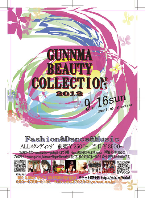 群馬の星Xanaさんご出演 http://mixi.jp/view_diary.pl?id=1869345935&owner_id=52179396 モデルウォーキング練習風景 http://mixi.jp/view_diary.pl?guid=ON&id=1869099552&owner_id=52179396&guid=ON 遂に群馬に堂々誕生 『GunmaBeautyCollection2012』 〜夢への第一歩〜 Fashion&Dance&Musicが融合の大規模Eventです 光と映像と音楽が今までにない異空間を作り上げ、RANwayでは、モデルがウォーキングで華麗に舞い、showcaseにはDancerが舞い踊り、