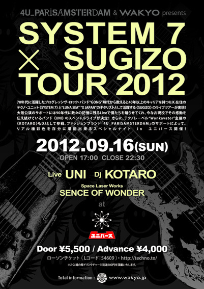 コミュニティメンバーのみなさま告知を失礼いたします。 SYSTEM 7 x SUGIZO TOUR 2012 大阪公演のお知らせです。 (9/21東京公演もあります!詳しくはサイトをご確認ください) http://www.techno.to/search.php?type=1&word=TT-SS_TOUR2012 * * * * * * * * * * * * * * * * * * * * * * * * * * * * * * * * * * * * * * * 70年代に活躍したプログレッシヴ・ロック・バンド“GONG”時代から数えると40年以上の キャリアを持つU.K.在住のテクノ・ユニット《SYSTEM 7》と “LUNA SEA”、“X JAPAN”のギタリストとして活躍する《S