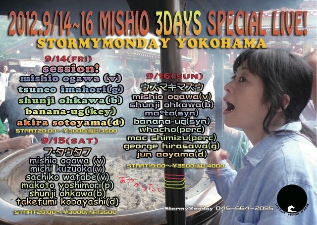 16(日)(オレの誕生日) 小川美潮(Vo) 大川俊司(B) Ma*To(synth) banana-UG(Key) Mac清水(perc) whacho(Perc) George平沢(G) トッティー(Dr) ★OPEN18:00/START19:00〜/LIVE CHARGE予約有り¥3500/当日受付\4000各ご飲食代別 045(664)2085 http://www.ss.iij4u.or.jp/~zukizuki/9.htm