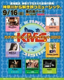 神奈川県で生まれた 音楽の祭典っ 開催日 2012年 09月 16日 (日) start:15:00〜 開催場所 象の鼻パーク http://www.mapion.co.jp/m/basic/35.4465813_139.6463727_8/t=simple/icon=home,139.6463727,35.4465813/ 出演者 県央地区代表(厚木市):E-Blue (LIVE A-I-M) ●横浜地区代表:MiyuMiyu(横浜音楽空間) ●川崎地区代表:有坂ともよ(カワサキストリートミュージックバトル) ●西湘代表(小田原市):