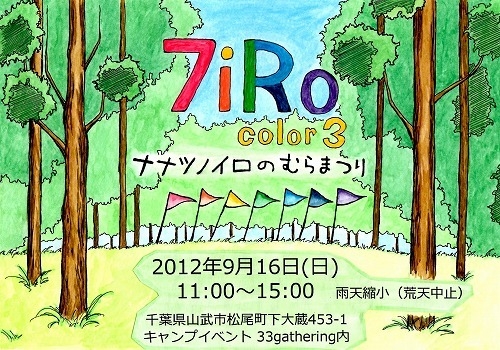 今年も7iRo開催決定!! 今回の7iRoは7つのジャンルの村を集めたマーケットを作ります。 こーーーんなステキなメンバーです☆ -------------------------------------------------------- 7iRo color3 ナナツノイロ の むらまつり 2012年9月16日(日) 11:00〜15:00 雨天縮小開催(荒天中止) 千葉県山武市松尾町大蔵453−1 (キャンプイベント33gathering内) 駐車場について 駐車料金は1台\500(開催中無制限) *駐車場には限りがございます。 混雑することが予測されますので な