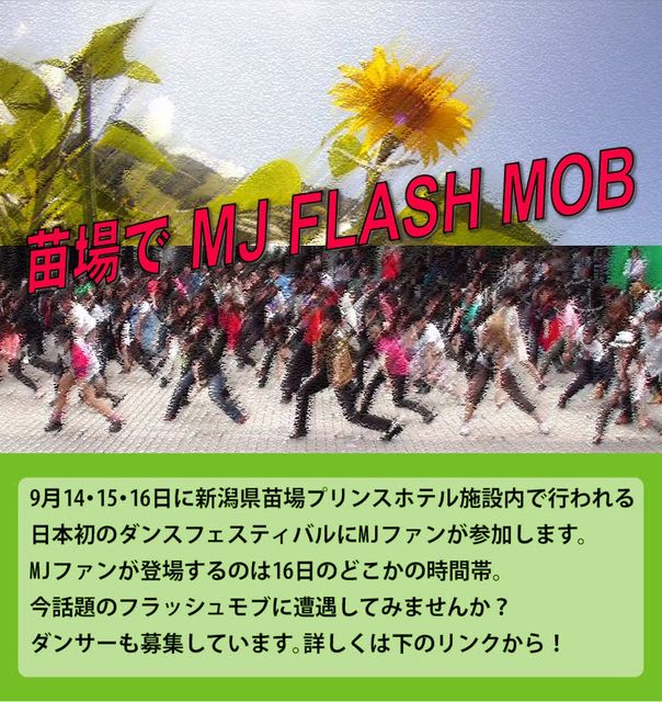 2012苗場でBeat it!!!のお知らせ 9/16(日)野外ダンスフェスティバル「movement dance festival2012」にて フェス主催のmovement様よりフラッシュモブの依頼をお受けしました! TtMJ埼玉で行ったBeat itとBADフラッシュモブを行うため、 このたび当コミュにて一般募集を行う運びとなりました。 まずはイベントのご案内です 9/14〜16に新潟県・苗場スキー場で行われる野外ダンスフェスティバル「movement dance festival2012」!http://www.movement.ne.jp/naeba/ キーワードは“若者の元気” 参加も出来