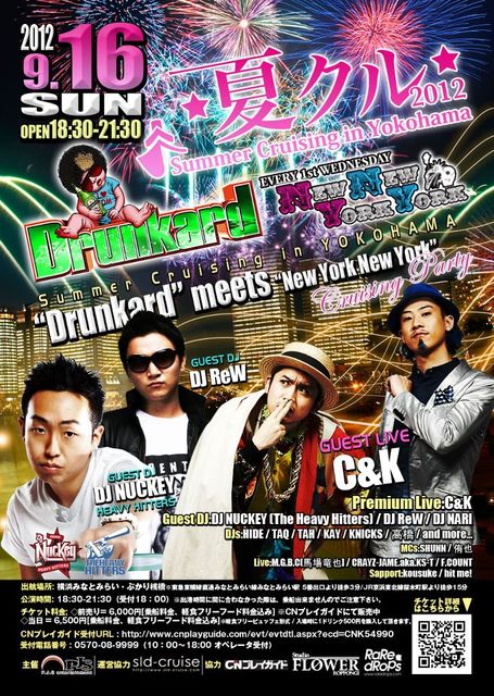 ☆夏クル☆-Summer Cruising in Yokohama- ※☆夏クル☆各日程チケット完売続出!!入場制限200名限定なので、お早目のお問い合わせをお願いお勧め致します。 -『Drunkard』 meets 『NEWYORK NEWYORK』- 横浜みなとみらいの夜景を一望できる200名限定の超豪華なクルージングパーティが9月16日祝前日、日曜日に開催決定!! 毎月第4金曜日に渋谷@Club ATLASで開催している大人気・No1泥酔PARTY"Drunkard"に毎月第1水曜日に渋谷@Club Camelotにて開催しているの満員御礼のBIG PARTY"NEWYORK NEWYORK"からResident DJを迎えた豪華コラボPA