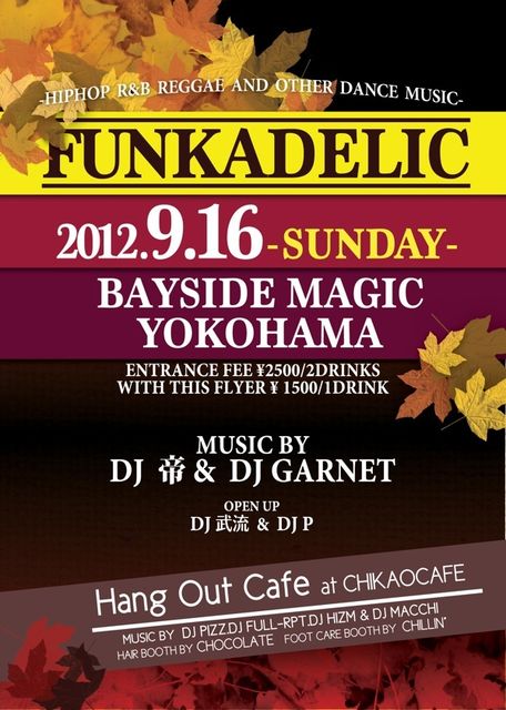 FUNKADELIC!! 「CM」 http://youtu.be/pxWek0spSyw 『FUNKADELIC & Hang out cafe』 2012. 9. 16 (日・祝前日) @BAY SIDE [HP] http://bayside-yokohama.jp/ [mixiコミュニティ] http://mixi.jp/view_community.pl?id=3482673 2009年5月3日(ゴールデンウィーク)にスタートし、 15回開催(5/3, 9/20 , 12/30 , 3/21, 5/3, 7/18, 9/19, 11/22, 12/30, 3/20,5/2,9/18,12/29,3/19,5/3) そしてその15回共に当日ご来場者200名オーバー、 年末のスペシャルでは250名を超える、様々な年齢層のお客様にお楽しみ