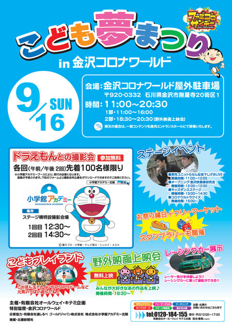 来る、9月16日(日)に、こども夢まつりが開催されます。 今話題のドラえもんとの無料撮影会をはじめ、人気の映画が無料で観れる野外映画!! 作品は子供に人気のディズニー車アニメ♪ ※敷物をお持ちください。 また、お祭り縁日やケータリングカー、会場を走るシャボン玉トレインもやってきます!! 一日、ご家族で楽しめるイベントです!! 是非、遊びに来てください♪ ■名 称:こども夢まつり ■主 催:こども夢まつり実行委員会 ■開催場所:金沢コロナワールド屋外駐車場 〒920 -0332 石川県金沢市無量寺 ■開催日時: