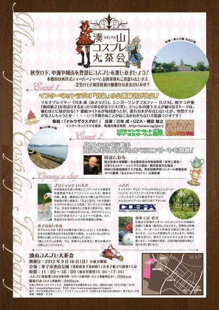 米子映画事変プレイベント「湊山コスプレ大茶会」開催決定! 秋空の下、中海や城山を背景にコスプレを楽しみましょう! 芝生、日本庭園、SLなど湊山公園は素敵なロケーションがいっぱい! 会場では、本格的な西洋式ティーパーティーとお抹茶席をご用意いたします。 芝生の上で和洋折衷の優雅なお茶席はいかが? ■日時:2012年9月16日(日)※雨天順延 11時〜16時(更衣室使用10時〜17時) ■会場:米子市湊山公園(鳥取県米子市西町133) ■参加費 ○入場無料 ○コスプレ参加費:1500円 (更衣室・クローク・