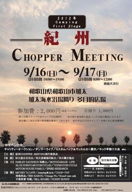 2012/09/16 日)〜17日(月 開催場所: 和歌山県 和歌山市加太 加太海水浴場隣り多目的広場 詳細: http://www.youtube.com/watch?v=jwSsFou8DQM 開催日 : 9/16(日)〜 9/17(月) 会場 : 和歌山県和歌山市加太 加太海水浴場隣り多目的広場 受付時間 : (日)10時〜17時 (月)8時〜12時 参加費 : 2000円(二日間フリーパス&キャンプ 記念パッチ付) 日帰り1000円(記念パッチは後日郵送) 中学生以下参加費無料 イベント : チャリティーオークション/ダンサーライヴ/カスタムバイク&マッスルカー展示/キック早掛け大会 etc 主催 : 紀州 CHOPPER MEE