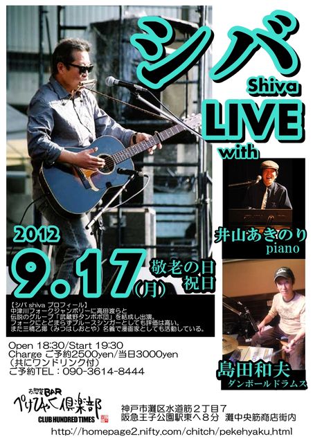 管理人様、告知させてください。 シバさんのライブが神戸は灘区であります。 ■2012.9.17(Mon) 敬老の日祝日 ■出演:シバ(Vo&Gt)/井山あきのり(piano)/島田和夫(ダンボールドラム) ■Open 18:30/Start 19:30 ■Charge ご予約 2500yen/当日 3000yen(共にワンドリンク付き) ■お惣菜BAR ぺけひゃく倶楽部:神戸市灘区水道筋2丁目7 http://mixi.jp/view_community.pl?id=1737393 ■ご予約TEL:090-3614-8444 宜しくお願いします!