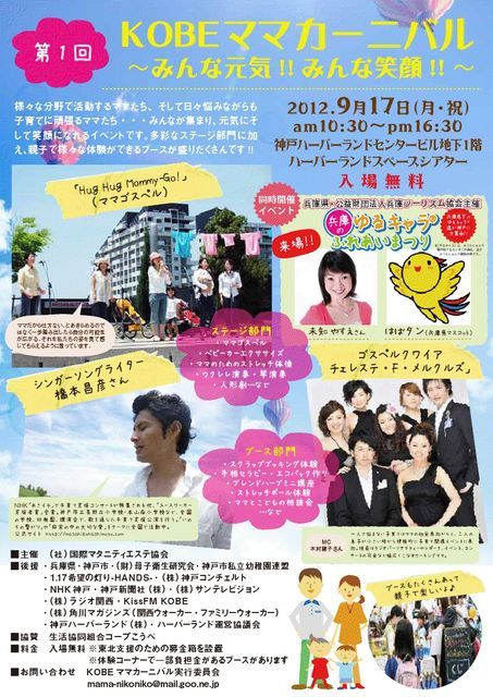管理人さま、貴重な場をお借りいたします。 こんにちは。 メンバーは全員、子育て真っ只中…というママのゴスペルグループ 『Hug Hug Mommy-Go!』と申します。 この度、子育てママを応援するイベントにライブ出演させていただくことに なりました 『第1回KOBEママカーニバル』 【Date】9月17日(月・祝) 10:30〜16:30 ※Hug Hug Mommy-Go!ライブ16:05〜16:30 【Place】ハーバーランド・ファミリオ内 スペースシアターにて 入場無料 12:20〜12:50にはシンガーソングライター寺尾仁