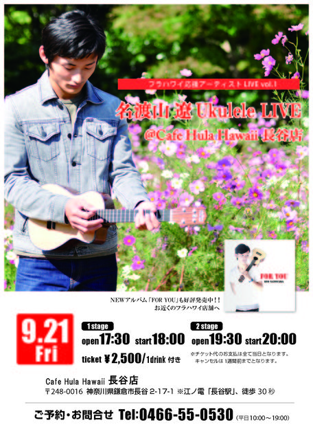 【名渡山 遼 Ukulele LIVE】@Cafe Hula Hawaii 長谷店 ウクレレ界に天才日本人プレイヤー現る!若干19才にして“日本のジェイク・シマブクロ"の呼び声高い「名渡山遼」LIVE! 2012年9月21日(金) チケット料金:2,500 1Drink 『1ステージ』OPEN 17:30 / START 18:00 『2ステージ』OPEN 19:30 / START 20:00 <名渡山 遼 ブログ>http://ameblo.jp/sunday-carpentry/ 場所:Cafe Hula Hawaii 長谷店 江ノ電「長谷駅」徒歩30秒! <長谷店HP>http://www.hulahawaii.co.jp/cafe/hase.html <長谷店ブログ>http://ameblo.jp/